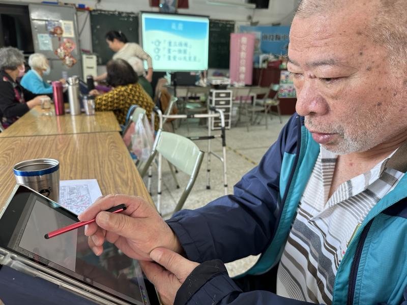 銀髮長者學員在課堂中手持觸控筆在平板上專注地用慢慢描繪心中的畫面。起初,他們的手勢略顯生疏,線條有些顫抖,但隨著老師一步步引導,長者們逐漸掌握觸控的節奏與力道。