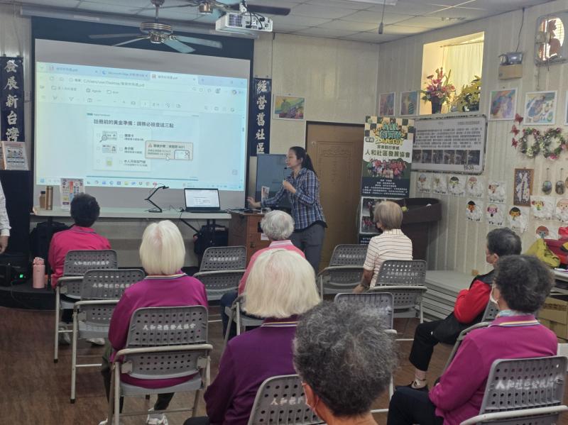 講師正針對「全民健保行動快易通」APP 的介面進行深度導覽,將「健康存摺」功能具象化。透過大螢幕呈現的視覺攻略圖,將複雜的 App 操作流程(如:虛擬健保卡申請、疫苗接種紀錄查詢、分級醫療概念)轉化為易懂的圖示資訊。此過程不僅提升了長輩的數位近用能力,也讓學員了解如何透過智慧行動裝置獲取精準的醫療資源,落實數位生活化的目標。