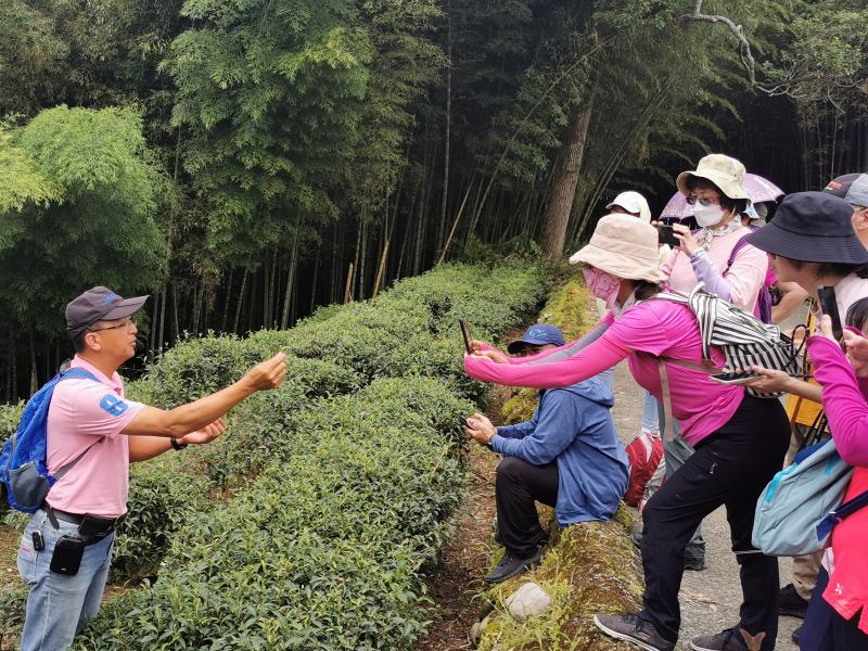 參與課程的學員們在導覽員講師的帶領下,進行實地生態導覽。講師正在為大家介紹當地自然生態的特點,並讓學員拿出手機,利用之前另一堂室內課所學到的APP來們更深入了解鹿谷地區的植物。學員們專注聆聽,並積極參與討論。
