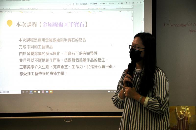 課程內容主要以半寶石材料與金屬線編材料包,創作產出半寶石項鍊以及半寶石金屬手環等綠工藝產品,運用天然的半寶石材料以及富有設計質感的金屬線材搭配,讓學員們以手做的方式做鑲嵌與裝飾設計,進而產出各種個性化的金屬飾品作品,