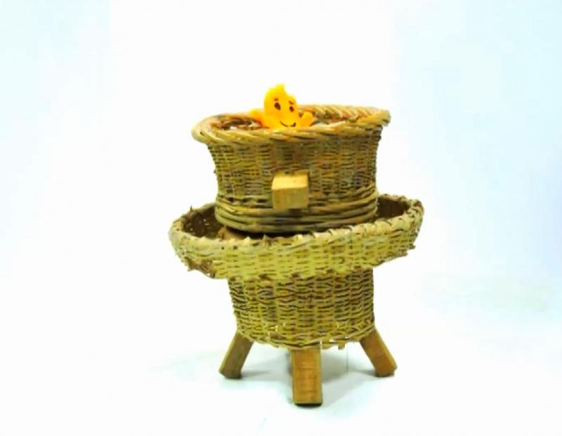 經由土壟、風車的粗加工後,米掉出來,畫面帶回婦人用單手接住掉下來的米。