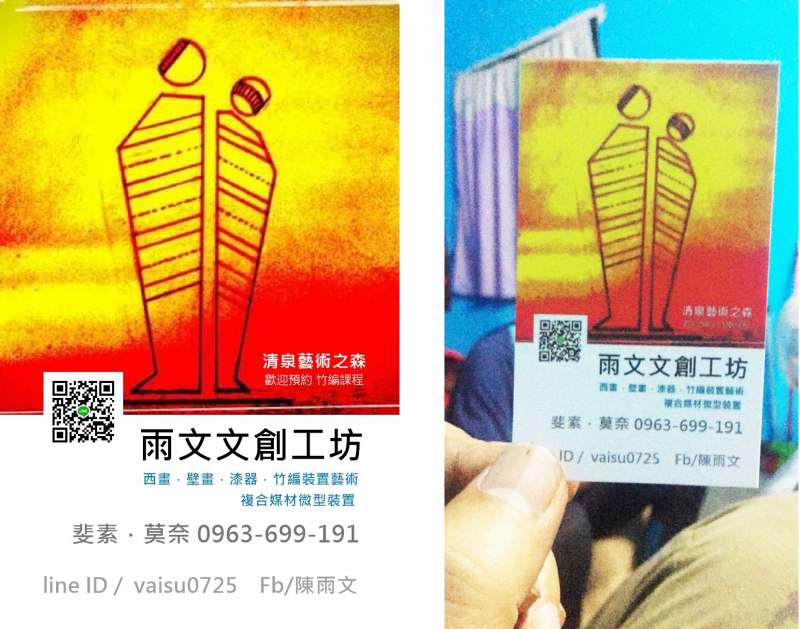五峰 DOC 數位設計應用課程,引領學員製作精美而有溫度的個人名片,成果圖張貼在五峰 LINE 群組中,引起許多「哇,好漂亮!」的迴響,也吸引了清泉藝術之森的藝術家前來 DOC 學習。
