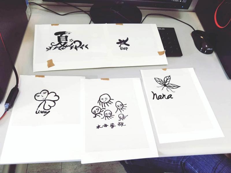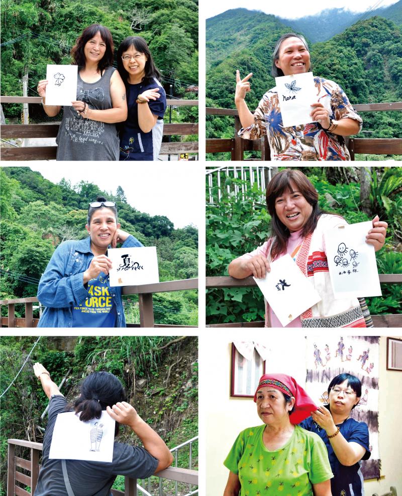 大家共同討論後,決定以頭巾、圍裙為設計主體,開始絞盡腦汁創意發想。娃囉依民宿老闆娘愛妹,設計出愛心微笑葉:「代表我和家人用心經營的民宿,希望讓旅人有家的感覺。」夏天的家部落廚房老闆娘月珠,以創意的「夏」延伸自然而浪漫的意象,開心說:「從第一堂課做了自己的名片、拍影片,現在還可以做自己圖樣的圍裙頭巾,DOC 好神奇,接下來我要用這個圖刻成部落廚房的招牌。」清泉導覽達人秀菊,熱愛此地的風光美景,經常觀察山林的細節,她特別手繪曾經在山裡遇見的「會飛的種子」,給予自己勉勵,希望將清泉所見所聞的美好,如種子傳遞給許多人,並讓喜愛五峰之心溫暖發芽。