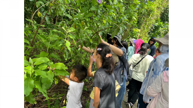 導覽人員介紹青蛾蠟蟬的習性,參與導覽民眾很興奮到處尋找其蹤跡.
