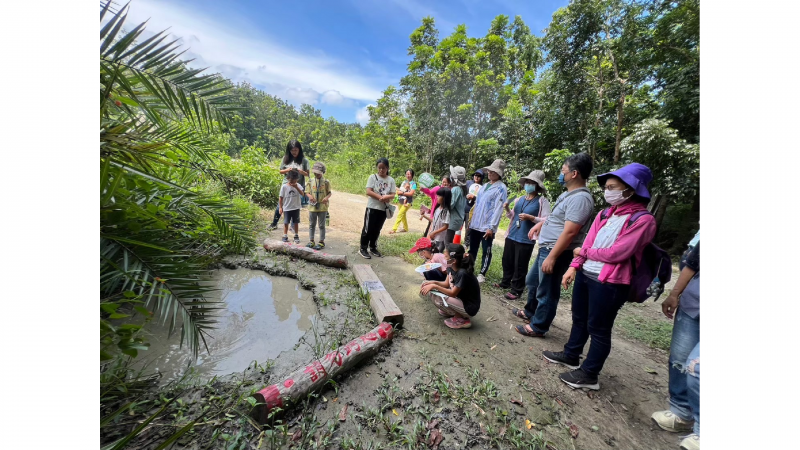 參加民眾聽著導覽人員詳細的解說並專注的觀察著噴泥盆泥漿的變化.