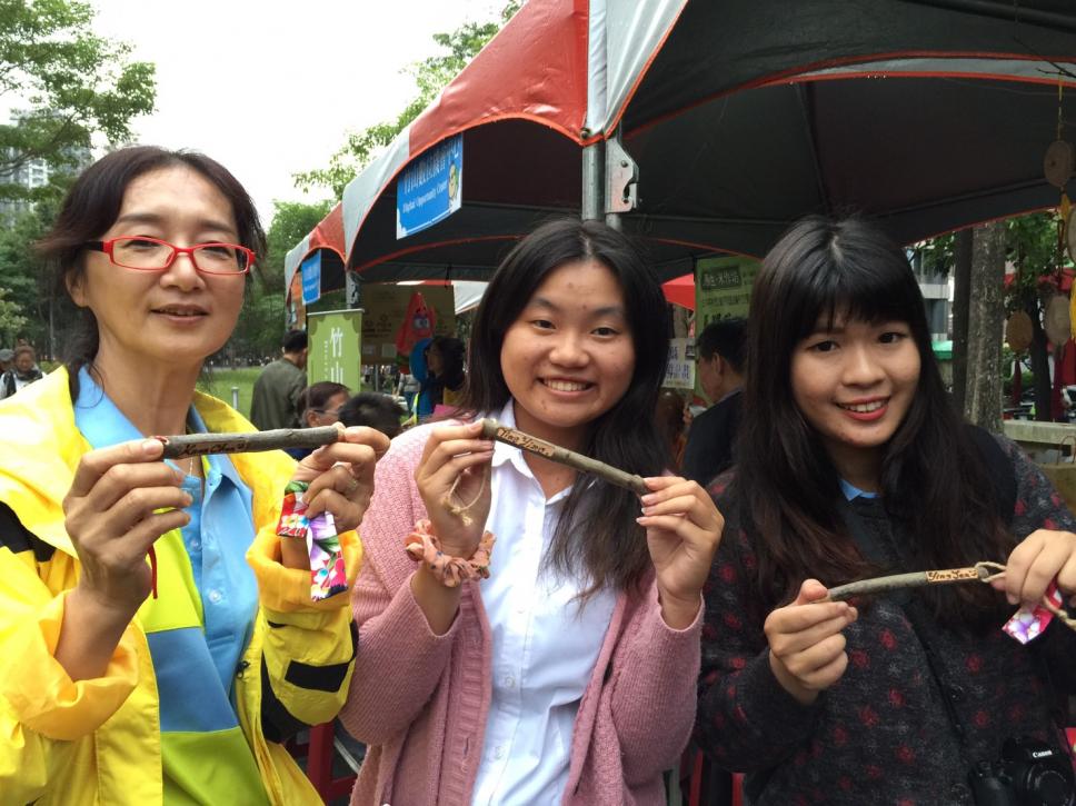 推廣在地農產品展,水里DOC學員展售將修剪掉梅枝,經過裁切後裝入筆心,再加工雕刻祝福語或名字,再套上客家布套,或綁上中國結裝飾成為有用再生新產品,可以書寫文字或送人當禮物,非常有意義及別出新裁.