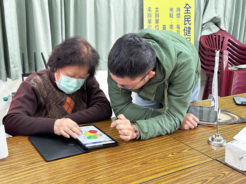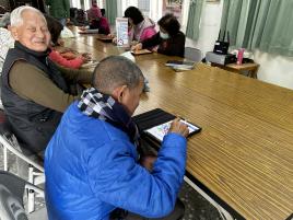 長輩專心地使用平板並露出開心笑容
