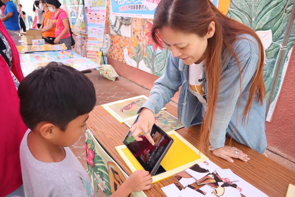 枋山DOC駐點志工於會場指導小朋友學習伯勞鳥數位拼圖遊戲。