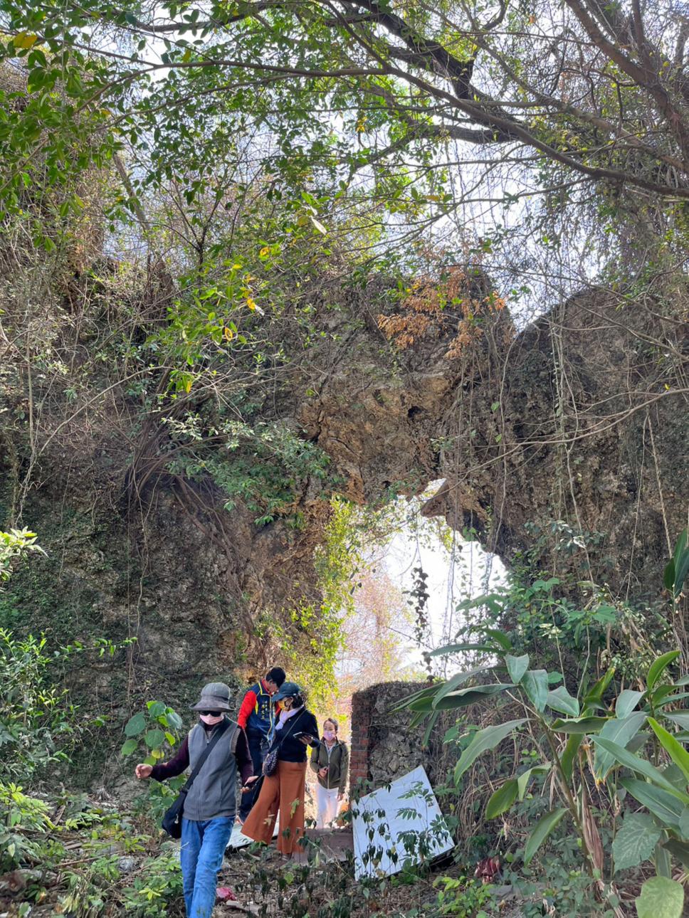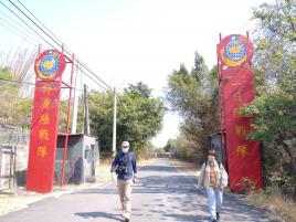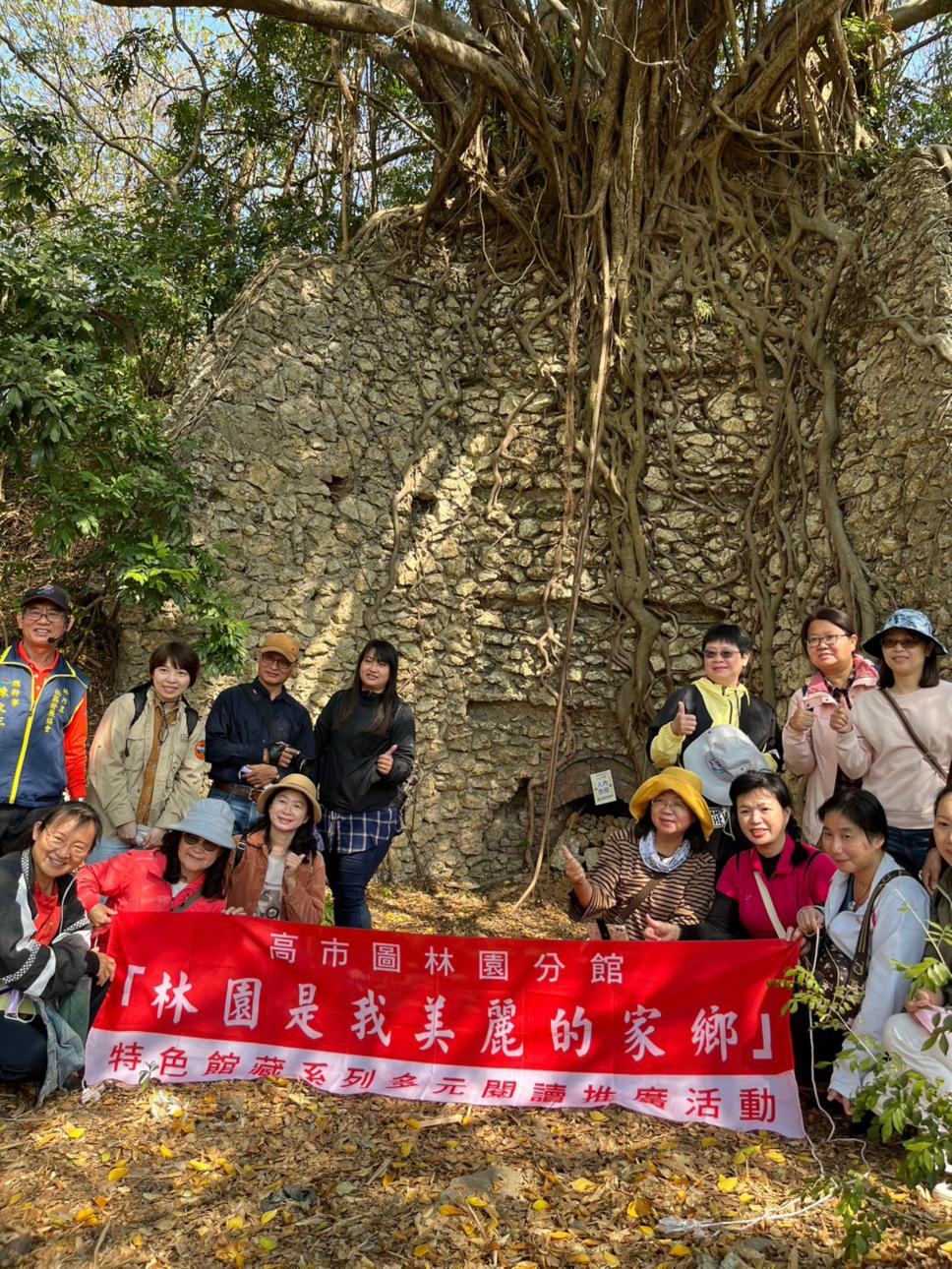 林園圖書館主任李文娟(右)及林內理事長陳文山(左)介紹走讀地點及故事傳說。