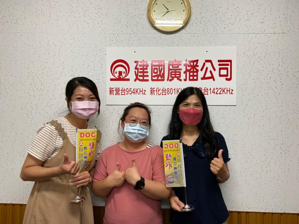 丁校長受邀接受建國廣播電台專訪,推廣鹽水 DOC 數位機會中心,希望 DOC 的設置可以縮短城鄉數位落差,年長者可以樂活學習、在地青農藉由數位行銷課程讓商品能在網路上有更多曝光度達到行銷成果、祖孫共學或親子共學課程增進親子情誼,歡迎民眾來鹽水 DOC 參加免費課程,一 起來學習電腦。
