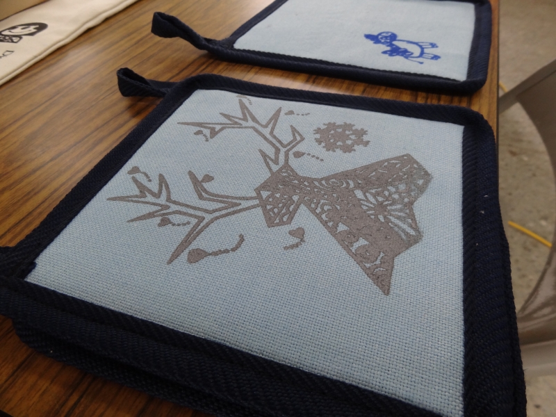 學員再利用絹印版,將圖案印製在老師替學員準備的布包,以及學員自己製作的布包、隔熱墊上。