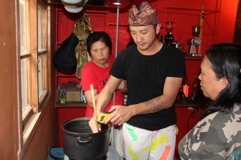 一群充滿好奇的學員圍在爐子前,老師從火候開始說起,並叮嚀每分鐘都要測溫,記錄溫度變化,最重要的事,在炒豆的過程當中,手不能停,如果偷懶,那麼豆子就不能均勻上色,於是同學們再次進行分組,兩人一組,一個負責炒豆,一個幫忙記錄溫度。