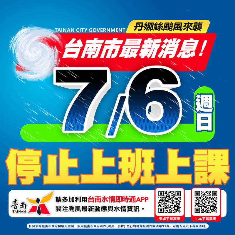 經"行政院人事行政總處全球資訊網-114年 7月 6日 天然災害停止上班及上課情形"公告 臺南市 今天已達停止上班及上課標準。本週日(7/6)課程停課一天 ...(詳細內容)