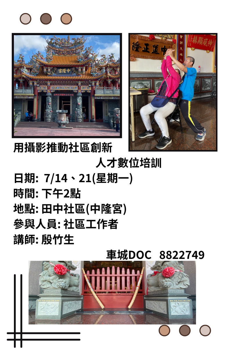 1. Canva 設計軟體介紹-註冊、線上使用規範 2. PC實際操作運用-版面套用及設計元素、輸出品格式設定 3.手機版本操作-卡片、海報、等等.....應用設計