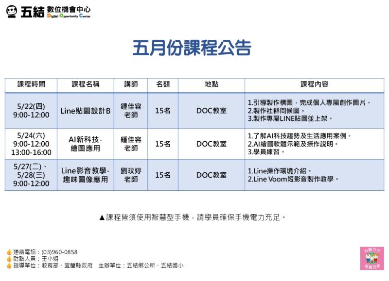 📣【五結DOC五月課程報名開跑囉!】📣 想學AI繪圖、設計自己的LINE貼圖,或是剪出吸睛的Line影音嗎? 我們幫你安排好了超實用又有趣的數位課程,通通免費、...(詳細內容)
