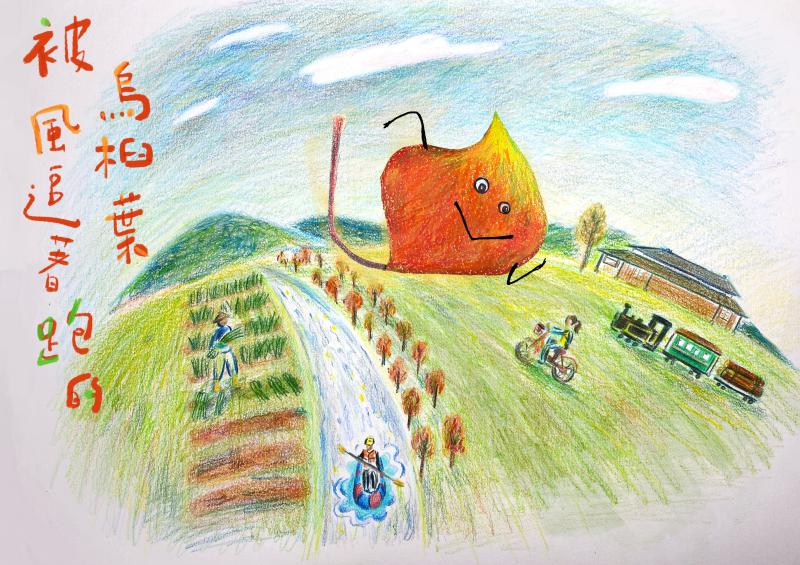 擬人化的烏桕葉,被三星的落山風吹著經過並介紹各個知名景點