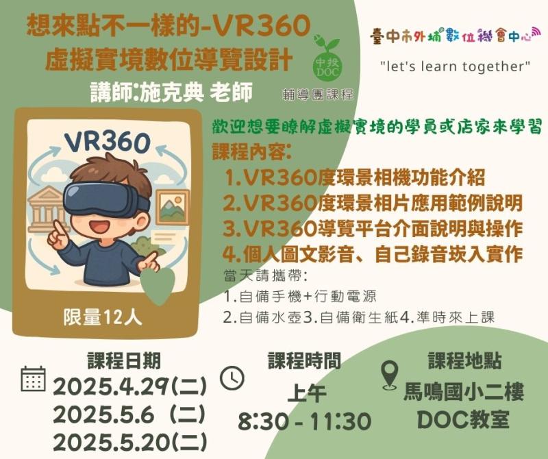 臺中市外埔數位機會中心~4/29+5/6+5/20(二)~想來點不一樣的-VR360虛擬實境數位導覽設計~課程招生中~歡迎踴躍報名 置頂