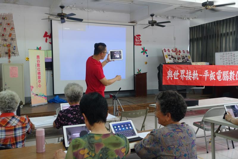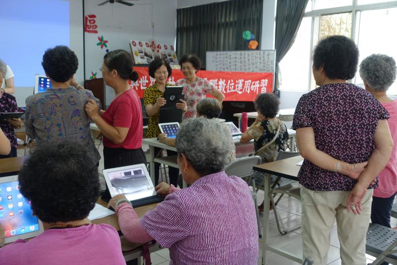一開始這些長輩們對平板電腦似乎有些害怕,一直不敢去觸摸它,經過老師的指導後,個個都玩得很開心,這應該是這些長輩們第一次接觸平板電腦吧!看著他們臉上的笑容,真的是老古錐~