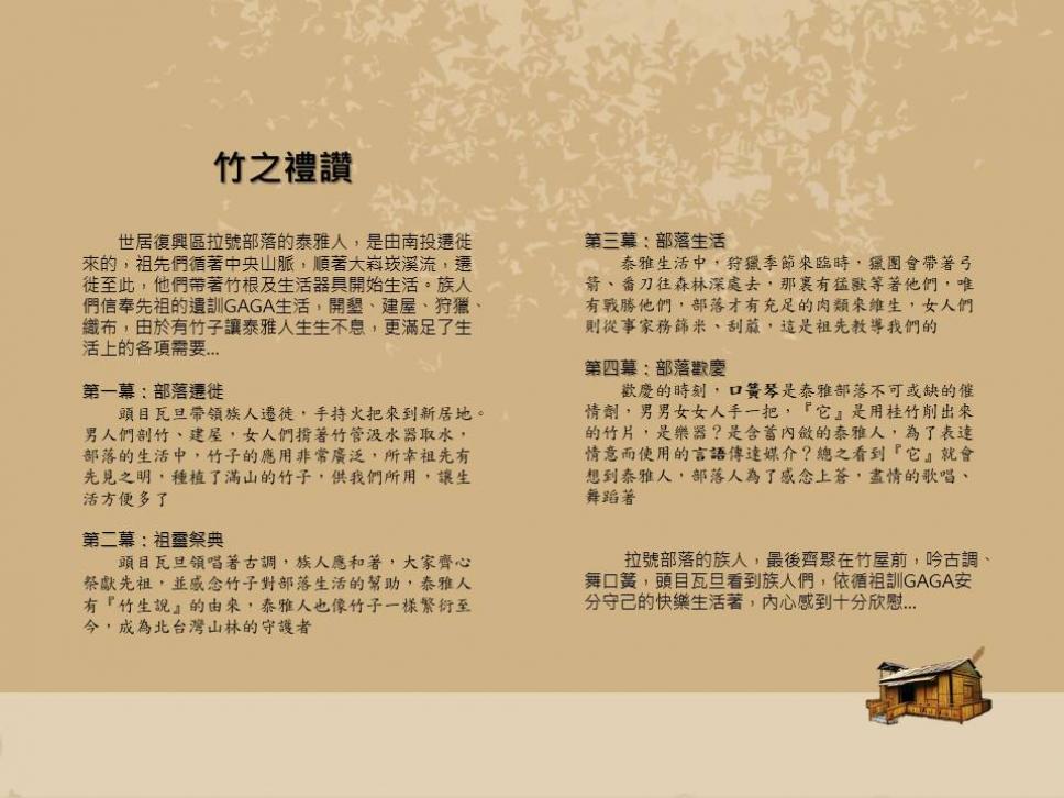 頭目瓦旦帶領族人遷徙,手持火把來到新居地。男人們剖竹、建屋,女人們揹著竹管汲水器取水,部落的生活中,竹子的應用非常廣泛,所幸祖先有先見之明,種植了滿山的竹子,供我們所用,讓生活方便多了