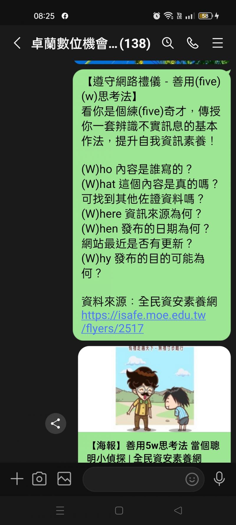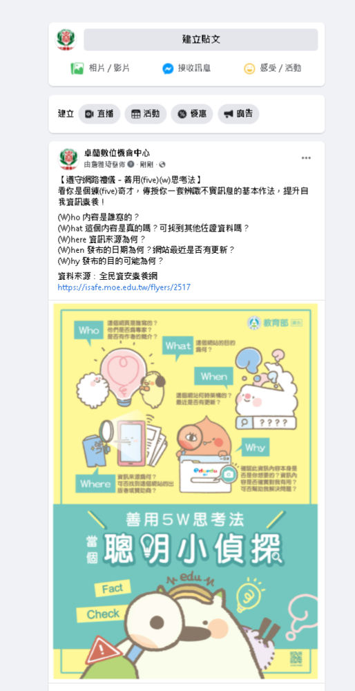 進一步瞭解到5W思考法,學習如何去辨別網路訊息避免陷入遭詐騙危機,透過宣導讓正確分辨媒體平臺或是網路社群所發佈的各項訊息,杜絕不當資訊肇生安全事件。