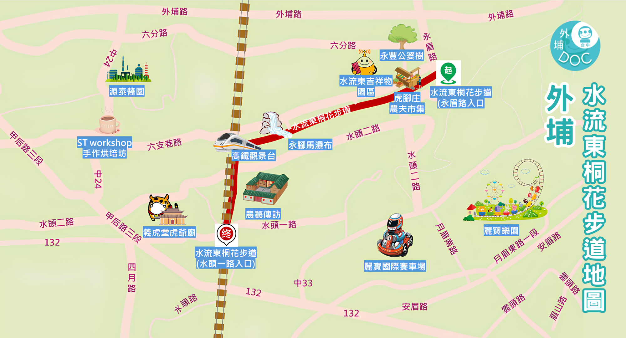 1.水流東桐花步道入口、農夫市集:入口假日限定的「農夫市集」聚集外埔、后里的小農與手作攤販,販售紅龍果、葡萄、蔬果、蜂蜜、點心等產地直送的美食。市集氛圍親切熱鬧,攤主會分享農事故事,是感受外埔人情味的第一站。