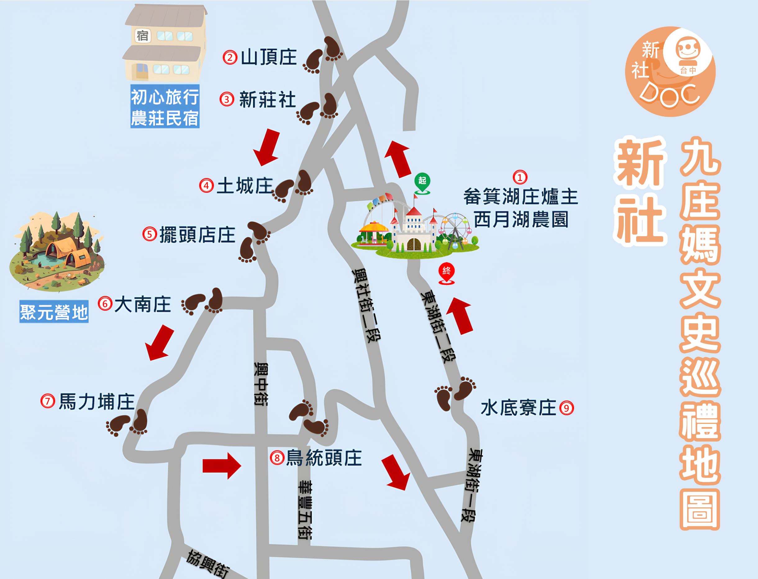 3.九個庄頭主要聚落:路線依值年庄安排,沿途停靠九庄(新社庄、山頂庄、畚箕湖庄、大南庄、水底寮庄、土城庄、馬力埔庄、擺頭店庄、鳥銃頭庄),供居民奉香祈福。(實際每年依當年值年庄調整)