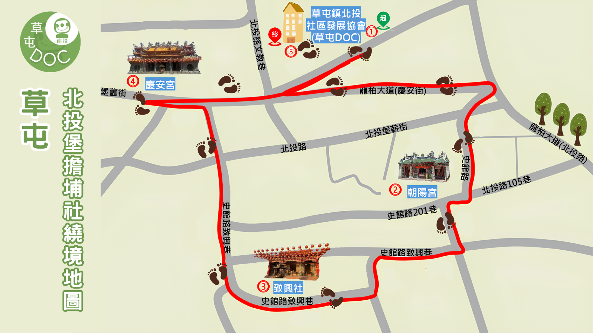 第一站【朝陽宮】:北投社區(DOC)出發右轉,沿【史館路】前行,第一路口左轉【慶安街】,前行約600公尺至十字路口右轉【史館路】,約200尺即抵達。