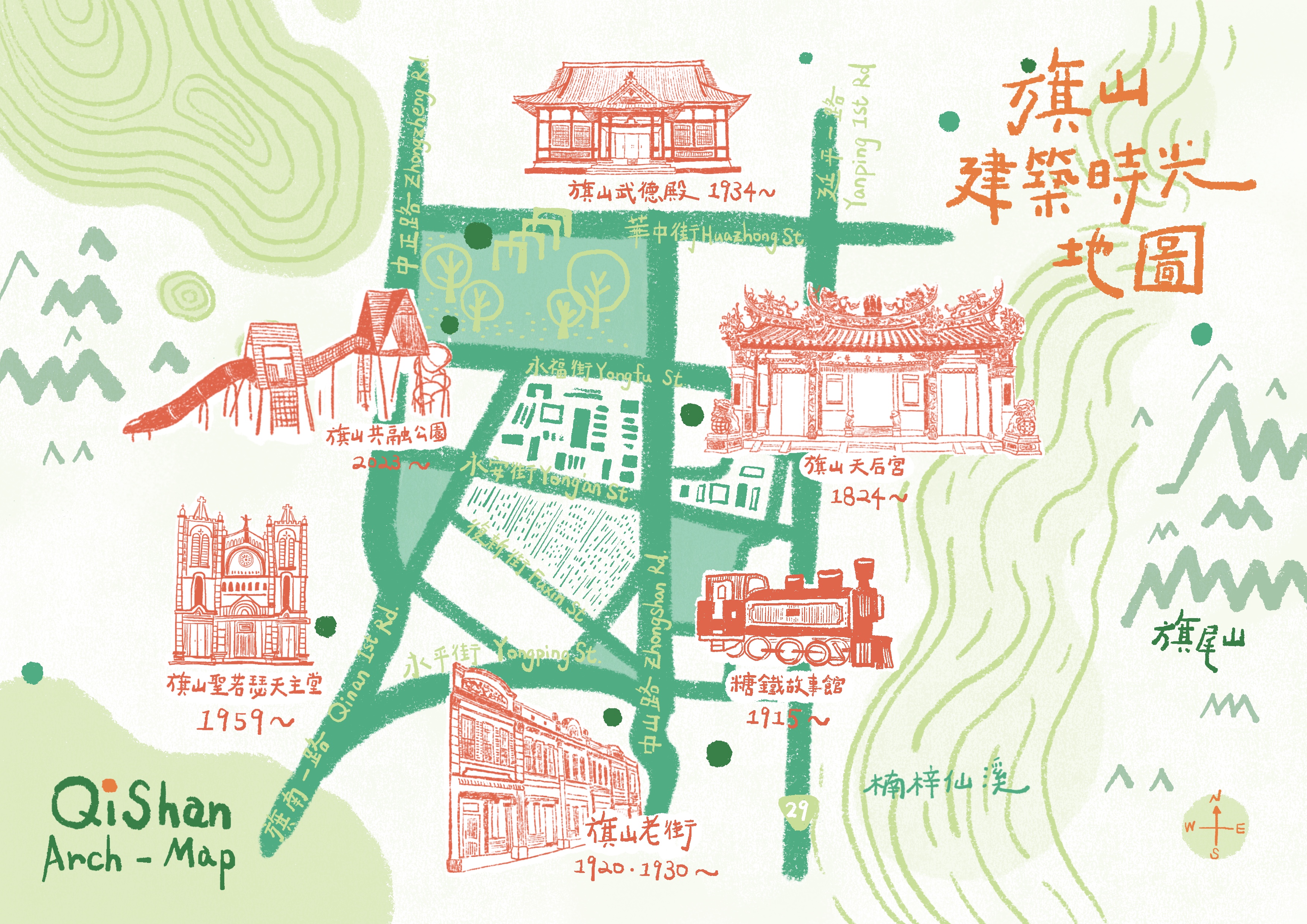 南下:國道三號於燕巢系統交流道轉國道10號往旗山,到達旗山端後左轉接台3線,走到T字路口時右轉,接台21線,約15-10分鐘即到達鎮上延平一路,復新街(左轉),中山路(右轉)。