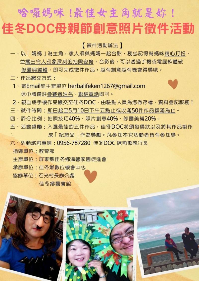 佳冬DOC今年母親節,邀請大家一起和親愛的媽咪來拍一張畢生難忘的創意照片!並將其作品寄來佳冬DOC,不但有參加獎,還有機會讓DOC為您準備高紀念價值的禮物喔!請一定要把握踴躍參加!