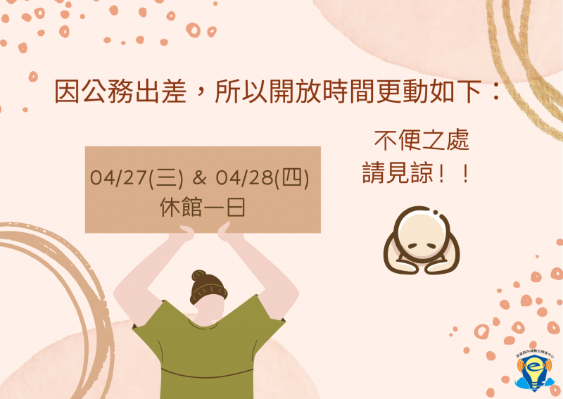 最新消息 DOC快訊 ::: <上一則 返回列表 下一則> 【休館公告】 發布日期:2022-04-25 人氣:156 04/27(三)&04/28(四) 因公務出差,休館一日 造成不便,請見諒! <上一則 返回列表 下一則>