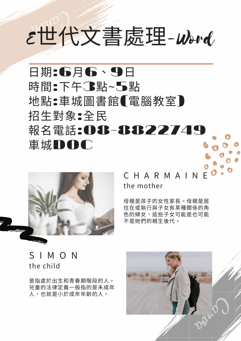 最新消息 DOC快訊 ::: <上一則 返回列表 下一則> E世代文書處理-Word 發布日期:2022-05-11 人氣:149 文書處理基礎課程Word、Excel、PowerPoint 招生囉! 三門.課程讓您一次上手 會一點點對任何事總是比不會來的美好,基礎文書處理課程開課囉! Word、Excel、讓您簡單上手並成為幫手, 『剛剛好』的簡報PowerPoint讓您人生倍覺精彩 車城DOC陪您一起來學習-豐富自我 報名專線: 08-882-2749 <上一則 返回列表 下一則>