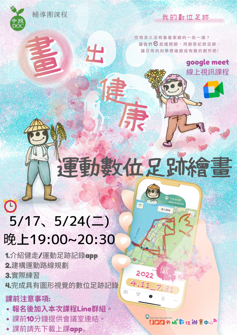 最新消息 DOC快訊 ::: <上一則 返回列表 下一則> ***線上Meet課程***臺中市外埔數位機會中心~5/17(二)&5/24(二)~運動數位足跡繪畫~課程招生中~歡迎踴躍報名 發布日期:2022-05-16 人氣:140 課程招生海報 <上一則 返回列表 下一則>