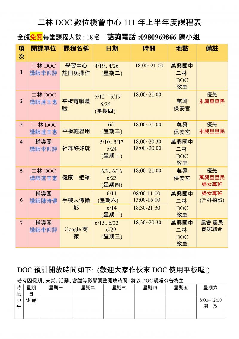最新消息 DOC快訊 ::: <上一則 返回列表 下一則> 二林DOC招生中!! 快來與我們一起輕鬆學習 發布日期:2022-05-18 人氣:176 2022上半年度課程表單 <上一則 返回列表 下一則>