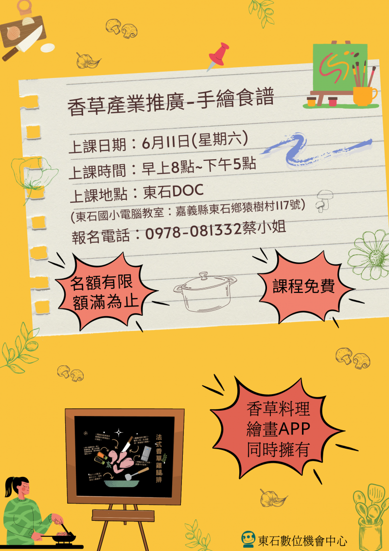 最新消息 DOC快訊 ::: <上一則 返回列表 下一則> 香草產業推廣-手繪食譜課程招生 發布日期:2022-05-25 人氣:170 上課日期:6月11日星期六 上課時間:早上8點~下午5點 上課地點:東石DOC教室 課程免費 名額有限 額滿為止 <上一則 返回列表 下一則>
