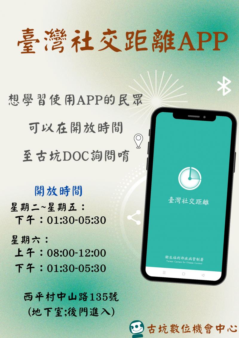 最新消息 DOC快訊 ::: <上一則 返回列表 下一則> 您下載了嗎?『臺灣社交距離』APP 發布日期:2022-04-29 人氣:116 您下載了嗎?『臺灣社交距離』APP 指揮中心宣布取消簡訊實聯制,鼓勵民眾下載「臺灣社交距離」APP,如果確診者14天內曾距離自己2公尺以內,並接觸超過2分鐘,APP就會發送通知。 想學習使用APP的民眾,可以在開放時間至古坑DOC詢問唷^^ <上一則 返回列表 下一則>