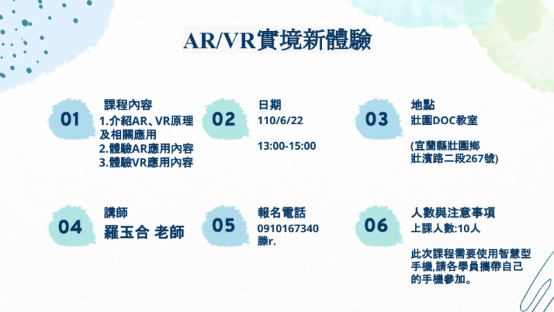 最新消息 DOC快訊 ::: <上一則 返回列表 下一則> 【課程訊息】AR/VR實境新體驗 發布日期:2022-06-06 人氣:170 這次的課程將帶大家掛上VR眼鏡感受虛擬實境, 相當特殊的體驗喔~。 日期: 6/22 時間: 13:00~15:00 地點: 壯圍DOC教室 (壯圍鄉壯濱路二段267號) 講師:羅玉合 報名方式:0910167340 滕r. <上一則 返回列表 下一則>