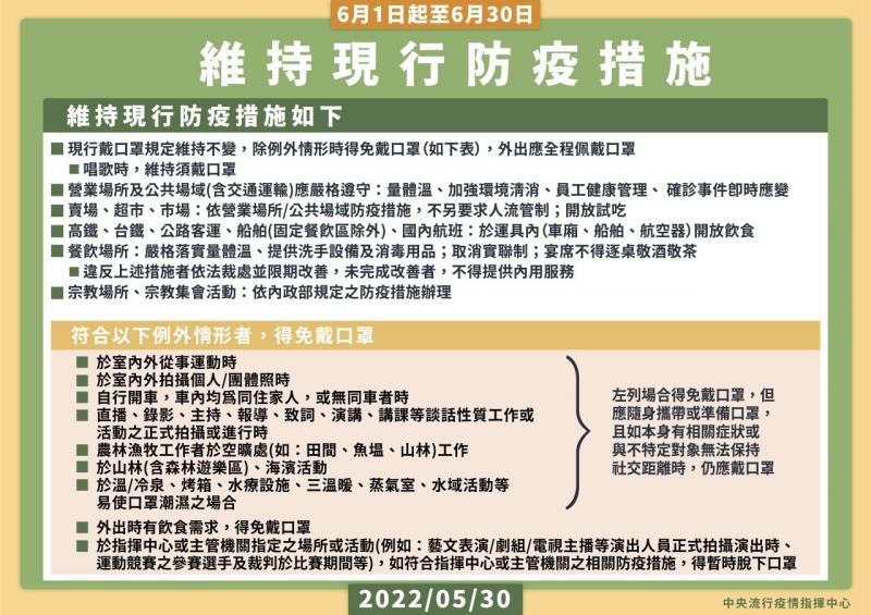 中央流行疫情指揮中心今(30)日宣布,鑒於COVID-19本土疫情持續升溫,且考量全臺已進入大規模流行階段,為兼顧防疫、經濟及社會運作,維持國內防疫量能與有效控管風險,經綜合評估疫情情勢,現行戴口罩等防疫措施維持至今(2022)年6月30日,相關規定說明如下: