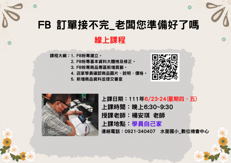 最新消息 DOC快訊 ::: <上一則 返回列表 下一則> 水里DOC_FB 訂單接不完,老闆您準備好了嗎課程招生公告 發布日期:2022-06-10 人氣:174 FB 訂單接不完,老闆您準備好了嗎課程招生簡章及掃瞄QR_code報名表單. <上一則 返回列表 下一則>