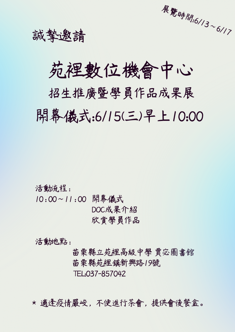 最新消息 DOC快訊 ::: <上一則 返回列表 下一則> 111年苑裡DOC招生推廣暨學員作品成果展 發布日期:2022-06-11 人氣:194 苑裡數位機會中心於6月15日(星期三)早上10:00 舉辦「招生推廣暨學員作品成果展」,歡迎大家蒞臨參加喔。 <上一則 返回列表 下一則>
