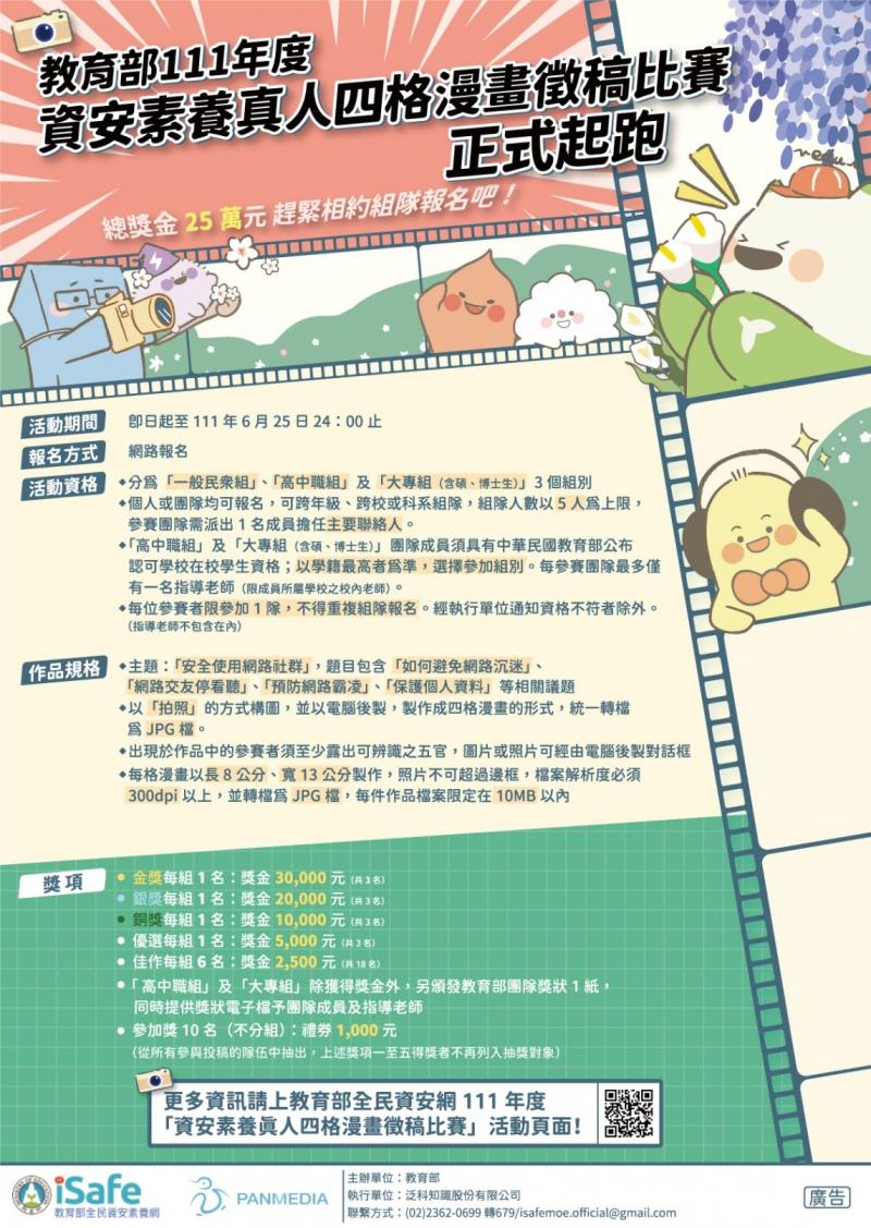 「資安素養真人四格漫畫徵稿比賽」活動收件時間即日起至111年6月25日止,分為「一般民眾組」、「高中職組」及「大專組(含碩、博士生)」三個組別。以「拍照」的方式構圖,並以電腦後製,製作成四格漫畫的形式,統一轉檔為JPG檔。出現於作品中的參賽者須至少露出可辨識之五官,圖片或照片可經由電腦後製對話框來呈現文字對話。每格漫畫以長8公分、寬13公分(容許正負0.5公分尺寸差異)製作,照片不可超過邊框,檔案解析度必須 300dpi以上,並轉檔為JPG檔,每件作品檔案限定在10MB以內。