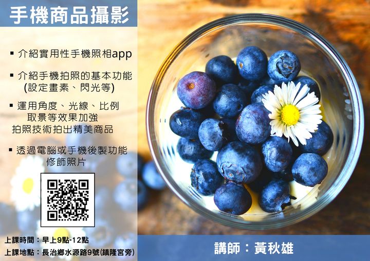 最新消息 DOC快訊 ::: <上一則 返回列表 下一則> 4/23(六)手機商品攝影開放報名中 發布日期:2022-04-23 人氣:119 4/23(六)手機商品攝影開放報名中 讓知名講師來教你如何靠角度和擺飾拍出好看的商品 課程內容: 1.介紹實用性較高的手機照相app 2.介紹手機拍照的基本功能、設定畫素、閃光等 3.運用角度、光線、比例、取景等效果加強拍照技術拍出精美商品 4.透過電腦或手機後製功能修飾照片 上課地點:屏東縣長治鄉水源路9號(鎮隆宮旁) 上課時間:早上9點-12點 報名網址:https://www.surveycake.com/s/q3xpa <上一則 返回列表 下一則>