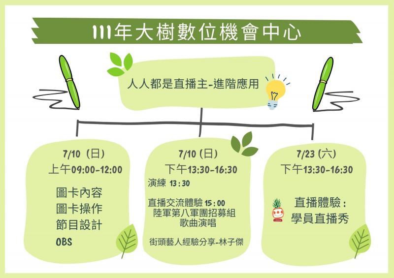 最新消息 DOC快訊 ::: <上一則 返回列表 下一則> 大樹DOC-人人都是直播主-進階應用課程招生 發布日期:2022-06-21 人氣:226 大樹DOC人人都是直播主-進階應用課程 : 還有2個名額 7/10 (日) 09:00-12:00、13:30-16:30 全天、 7/23(六)下午13:30-16:30上課 報名連結 : https://forms.gle/nqwukX5BPcm2SwPH8 <上一則 返回列表 下一則>