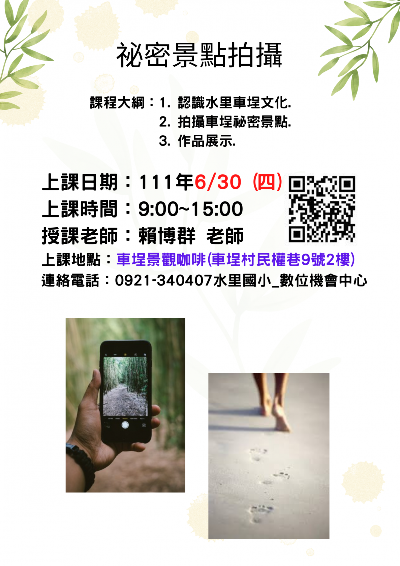 最新消息 DOC快訊 ::: <上一則 返回列表 下一則> 水里DOC_祕密景點拍攝課程招生簡章公告 發布日期:2022-06-22 人氣:191 祕密景點拍攝課程招生簡章及QR_code報名表單. <上一則 返回列表 下一則>