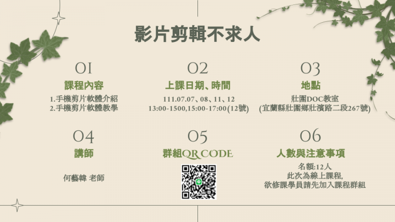 最新消息 DOC快訊 ::: <上一則 返回列表 下一則> 【課程訊息】影片剪輯不求人 發布日期:2022-06-30 人氣:155 影片剪輯聽起來雖然困難,但現在其實可以透過手機APP進行簡單的影片剪輯囉, 此次課程就將帶領大家用手機進學習影片剪輯。 日期: 111.07.07、08、11、12 時間: 13:00-15:00、15:00-17:00(12號) 講師:何藝韓 報名方式:此次課程為線上課程,欲修課學員請先加入課程群組。 若有上線問題,開課當日也可到DOC上課。 <上一則 返回列表 下一則>