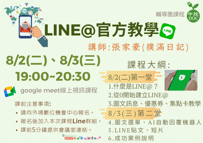 最新消息 DOC快訊 ::: <上一則 返回列表 下一則> ***線上Meet課程***臺中市外埔數位機會中心~8/2(二)&8/3(三)~LINE@官方帳號~課程招生中~歡迎踴躍報名 發布日期:2022-07-08 人氣:237 課程招生海報 <上一則 返回列表 下一則>