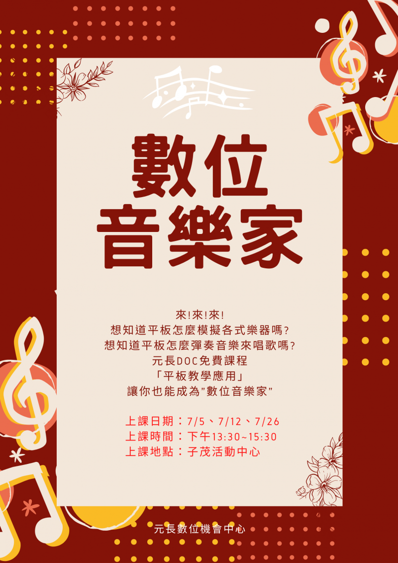最新消息 DOC快訊 ::: <上一則 返回列表 下一則> 數位音樂家 發布日期:2022-06-20 人氣:135 7月份行動DOC課程來了~! 來!來!來! 想知道平板怎麼模擬各式樂器嗎? 想知道平板怎麼彈奏音樂來唱歌嗎? 元長DOC免費課程 「平板教學應用」 讓你也能成為"數位音樂家 「數位音樂家」課程 上課日期:7/5、7/12、7/26 上課時間:下午13:30~15:30 上課地點:子茂活動中心 <上一則 返回列表 下一則>