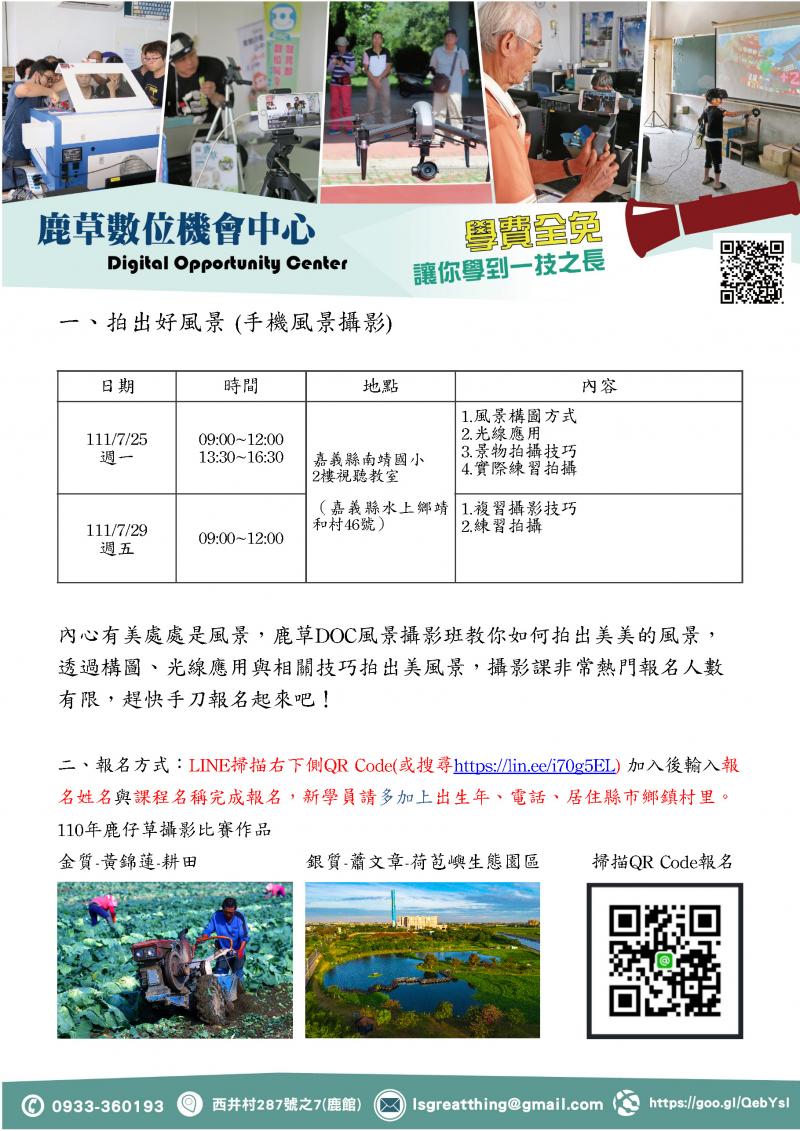 最新消息 DOC快訊 ::: <上一則 返回列表 下一則> [資訊課程] 拍出好風景 發布日期:2022-07-17 人氣:205 內心有美處處是風景,鹿草DOC風景攝影班教你如何拍出美美的風景,透過構圖、光線應用與相關技巧拍出美風景,攝影課非常熱門報名人數有限,趕快手刀報名起來吧! 課程時間: 111/7/25 09:00~12:00、13:30~16:30 111/7/29 09:00~12:00 課程地點: 嘉義縣南靖國小2樓視聽室 報名連結:https://lin.ee/i70g5EL 加入後輸入報名姓名與課程名稱完成報名, 新學員請多加上出生年、電話、居住縣市鄉鎮村里 <上一則 返回列表 下一則>