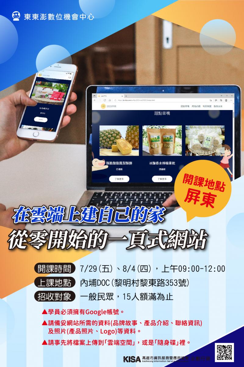 最新消息 DOC快訊 ::: <上一則 返回列表 下一則> 【在雲端上建自己的家】 發布日期:2022-07-12 人氣:185 https://forms.gle/ZrEw1r4FUAADJy6E8 開課囉! 如何從零開始建立自己的一頁網 講師一步一步帶你建立自己的網站 有興趣的學員趕緊報名吧! 報名網址 https://forms.gle/ZrEw1r4FUAADJy6E8 注意事項 學員必須擁有Google帳號。 請備妥網站所需的資料(品牌故事、產品介紹、聯絡資訊)及照片(產品照片、Logo)等資料。 請事先將檔案上傳到「雲端空間」,或是「隨身碟」裡。 <上一則 返回列表 下一則>