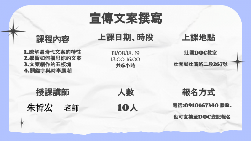 最新消息 DOC快訊 ::: <上一則 返回列表 下一則> 【課程訊息】宣傳文案撰寫 發布日期:2022-07-28 人氣:339 想推廣商品或活動不知道該如何處理文宣的部分嗎?那這堂課非常適合有需要的人來聽聽喔~。 課程名稱:宣傳文案撰寫 課程日期:111/08/18、19 時段:13:00-16:00 授課講師:朱哲宏 上課地點:壯圍DOC教室(宜蘭縣壯圍鄉壯濱路二段267號) 人數:10人 報名方式:電話0910167340 滕R. ,也可直接至DOC報名。 <上一則 返回列表 下一則>
