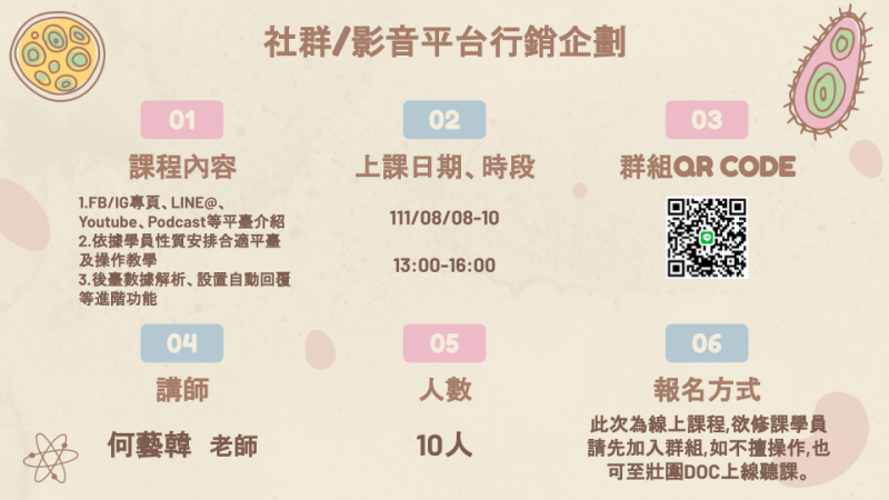 最新消息 DOC快訊 ::: <上一則 返回列表 下一則> 【課程訊息】社群/影音平台行銷企劃 發布日期:2022-07-29 人氣:185 想利用LINE,FB的社群軟體推廣自己的產品嗎,那這堂課千萬不要錯過囉。 課程名稱:社群/影音平台行銷企劃 課程日期:111/08/08~10 時段:13:00-16:00 授課講師:何藝韓 人數:10人 報名方式:此次為線上課程,欲修課學員請先加入群組,如不擅操作,也可至壯圍DOC上線聽課。 <上一則 返回列表 下一則>